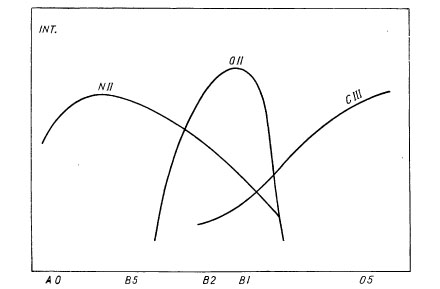 spectral type of the intensities of an NII-, an OII- and a CIII-line. Let us