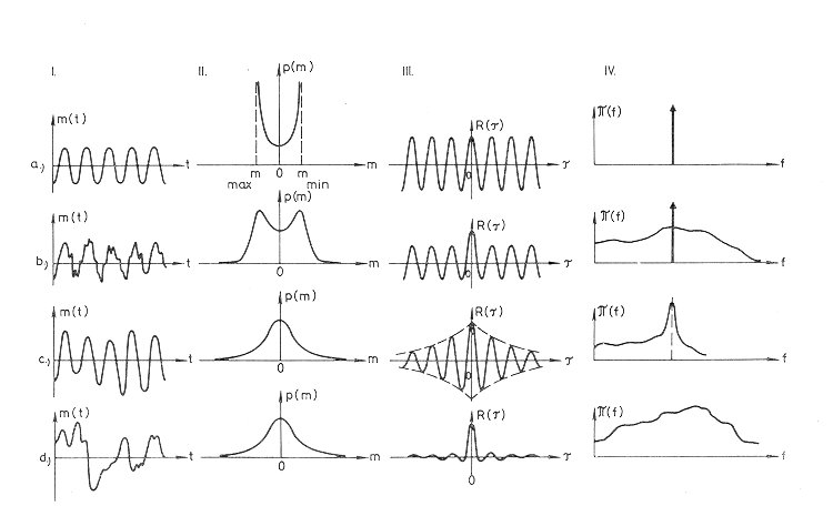 (5) Pi(f) is called the power spectral density function. That is a breakdown of the light curve into sinusoidal components and gives the mean squared amplitude of each component. In the first column of Fig. 1. we see four special light curves, a sine wave (a), a sine wave with superposed irregularity (b), a narrow-band random light curve having cycles of nearly equal length (c), and a wide-band random light curve with strongly different cycles (d). In the next column of Fig. 1. we see the corresponding probability density function plots. For the sine wave we have the maxima for p(m) at the extremities, because the curve varies slowly there. Next to the right we see the autocorrelograms. The sharply peaked autocorrelogram diminishing rapidly to zero (d) is typical of wide-band random data with a zero mean value. The autocorrelogram for the sine wave with random noise is simply the sum of the autocorrelograms for the sine wave and random noise separately (b). On the other hand, the autocorrelogram for the narrow-band random light curve appears like a decaying version of a sine wave autocorrelogram. Finally we see the corresponding power spectra. A discrete power spectrum for a sine wave and a relatively smooth and broad power spectrum for the wide-band random light curve. The power spectrum for the sine wave with irregularities is the sum of the power spectra for the sine wave and the random case separately. On the other hand, the power spectra for the narrow band random light curve is sharply peaked, but still smoothly continuous as for random light-curve. The period corresponding to the peak may be called as pseudo-period. The four examples illustrate a definite trend in all the three parameters going from the sine wave to the wide-band noise case. The principal application for an autocorrelation and for a power spectral density function is the detection of periodicities which might be masked in a random background. Any periodicity in the light variation will manifest itself as a series of peaks corresponding to a fundamental and its harmonics. Such method of analysis requires enormous amount of computation, hence it has not been popular in the past. With the aid of high speed computers this is no longer a problem. However, the requirements of accuracy, extent, continuity, and reasonable homogeneity for the light curve to be analysed restrict considerably the applicability of the method to semiregular or irregular variable stars. Only one single semiregular variable was till now treated by this way, mu Cephei, on the one hand by Ashbrook, Duncombe and Woerkom (1954), who found the light curve to result from stochastic rather than harmonic processes, on the other hand by Sharpless, Riegel and Williams (1966) with the conclusion that the light variations are characterized by a much greater degree of regularity than is generally attributed to stars classed as semiregular variables.