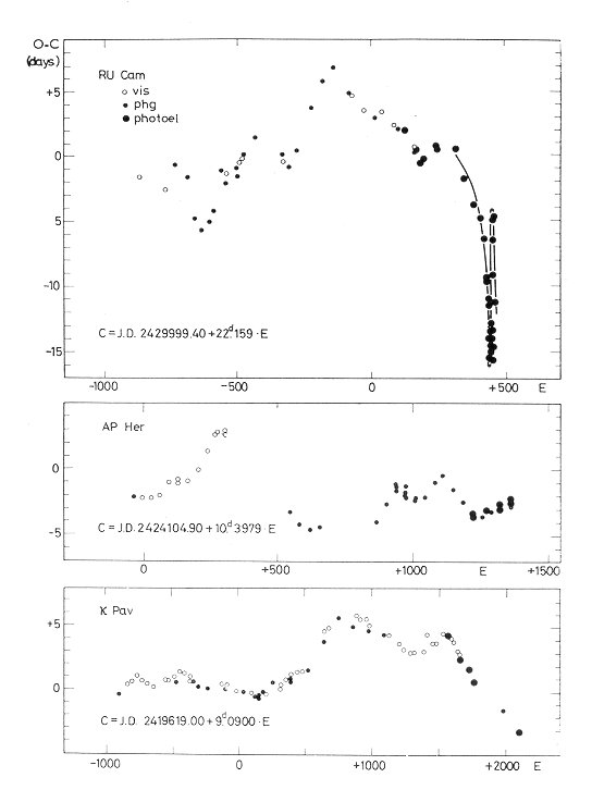 Fig. 2. O-C diagrams for three W Virginis-type variables, RU Cam, AP Her and kappa Pav. That for AP Her is taken from Kwee (1967). For RU Cam, the strongly oscillating phase corresponds to the recent semiregular behaviour of the star. Till now we have no evidence of evolutionary period-changes for most kinds of variables. Some cyclic terms in the O-C diagrams can be interpreted as due to binary or apsidal motion, but generally they must be treated as cumulative effects of random fluctuations. The value of sigma can be determined from the O-C diagrams. Several attempts have been made to represent the time sequence of explosions of eruptive variables by a Markov chain. Yet, as Mme Lortet-Zuckermann (1966) has stated, the Markov chain seemed poorly adapted for the representation of the sequence of the various sorts of explosions of the SS Cygni stars. Stellar variability refuses compliance with simple mathematical models. The maxima or minima of an ideally irregular variable would be distributed at random, and the cycle lengths l would follow a Poisson-distribution: