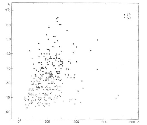 Fig. 3. Period-amplitude relation for longperiod (points) and semiregular (crosses) variables in Sagittarius.