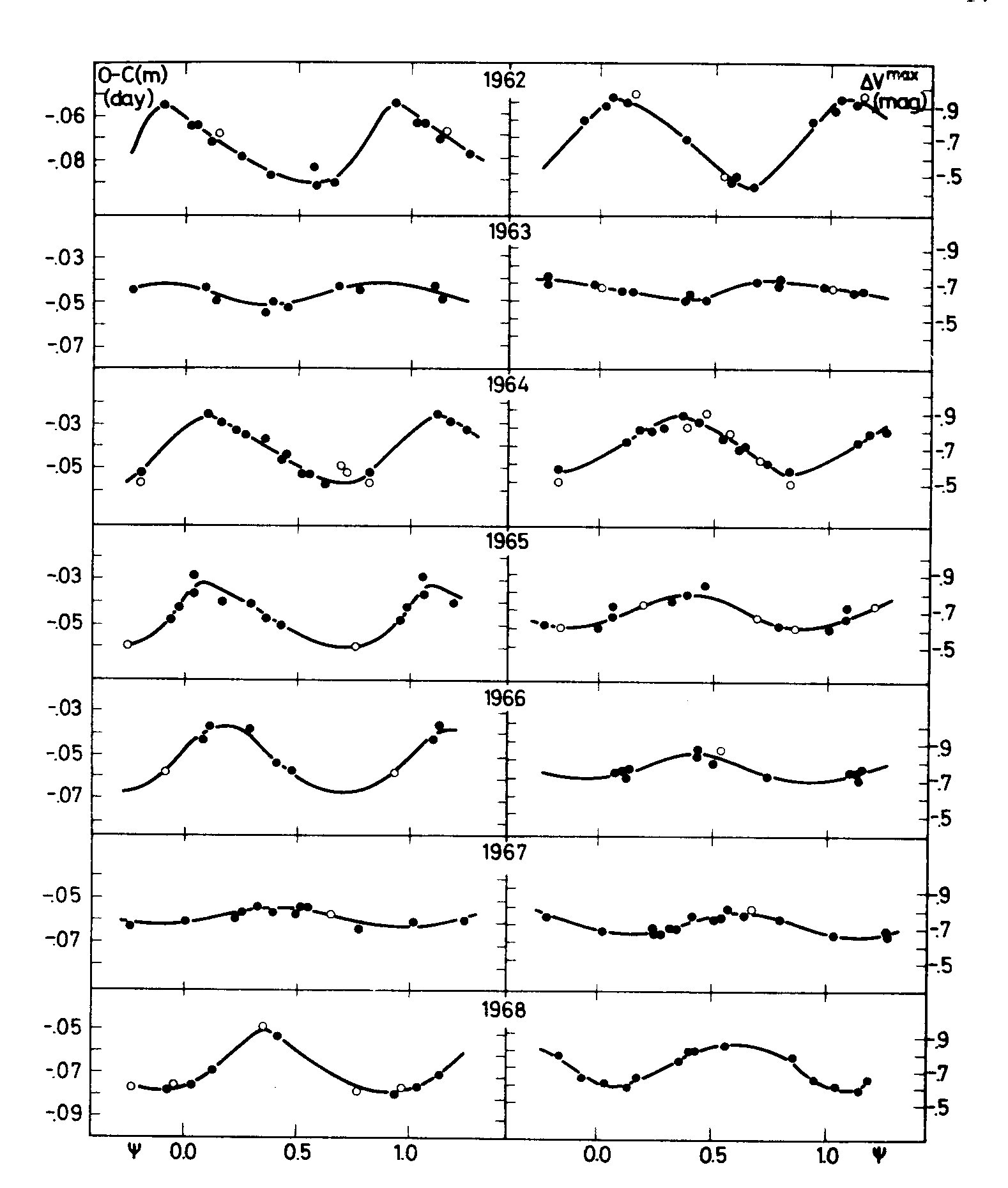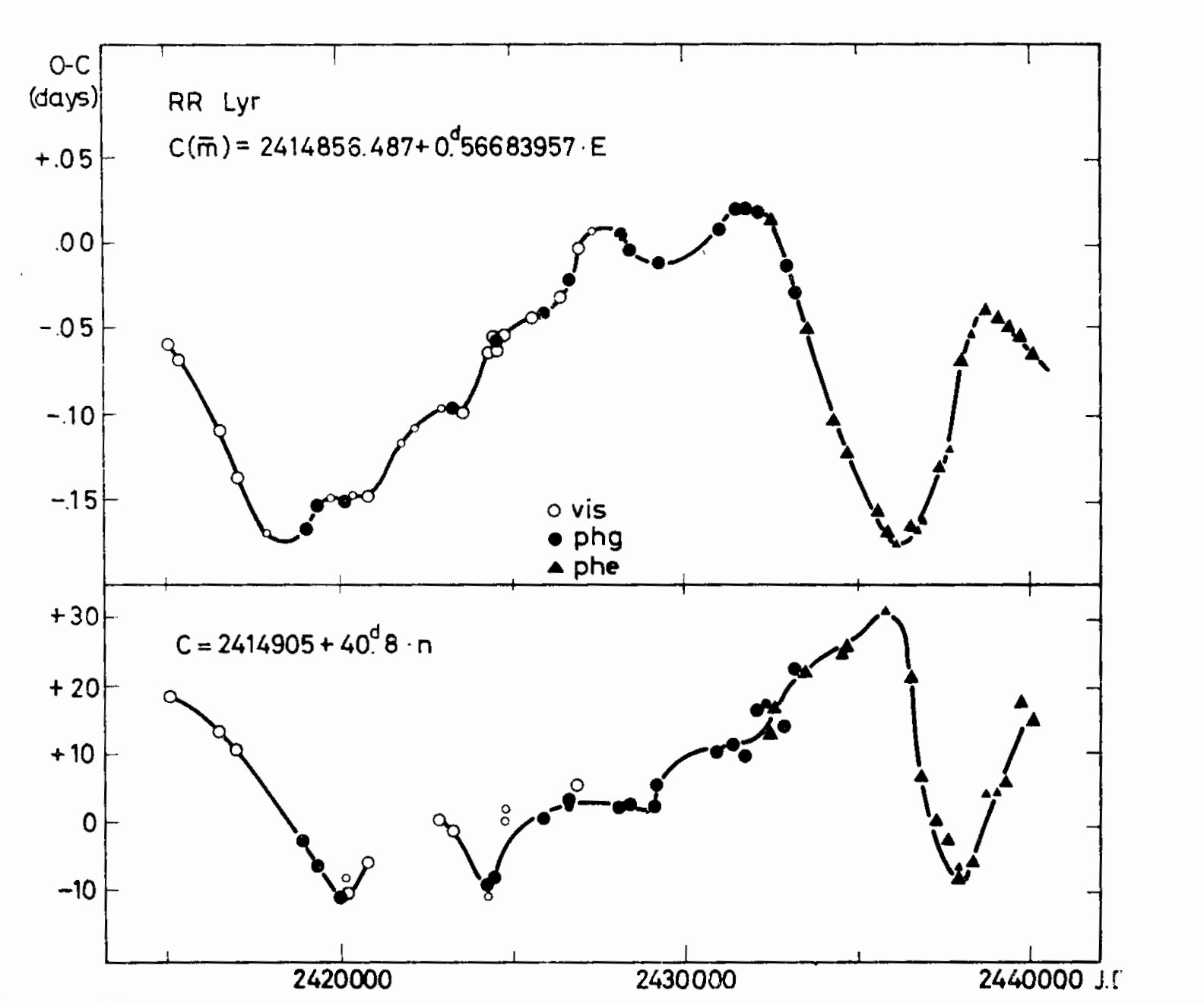 Fig. 4. O-C diagrams for the fundamental and secondary periods of RR Lyrae. She made the proposal that RR Lyrae is an oblique rotator with a rotation period of 41 days, which is the period of the Blashko-effect. Preston (1967) has observed RR Lyrae for the Zeeman effect in 1963 and 1964 some 50 times and has not once found a measurable field. Yet, this negative result does not disprove, that the Blashko-effect and the irregularities connected with it are of magnetic origin. As Fig. 6 prepared by Szeidl shows, the Blashko-effect is a very erratic phenomenon, the amplitude of the phase variations and that of the maximum light variations are changing strongly from time to time, they are sometimes scarcely observable.* The same may happen with the magnetic field. In any case, the greatest part of magnetic activity might take place, as on the sun, below the photosphere. * In RR Gem a strong Blashko-effect was observed till about 1937 which disappeared later. For Delta Scuti variables and dwarf Cepheids we do not observe the suppression of the amplitude in stars with secondary periodicities, and such stars have the same simple O-C diagrams as variables with stable light curves. Here, the secondary periods may originate from non random influences, e.g. from tidal effects as proposed by Fitch (1962).