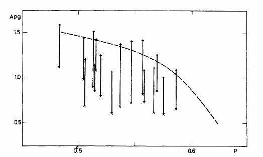 Fig. 5. Period-amplitude diagram for RRab stars in M3 according to Szeidl (1965) The dotted line shows the relation valid for stable light curves, the vertical lines show the limits of A_pg for RRab stars with Blashko-effect. RU Camelopardalis, a peculiar W Virginis-type Cepheid offers now a unique opportunity for studying the interplay between pulsation and irregular stellar activity. Demers and Fernie (1966) made three years ago the remarkable discovery that the star nearly stopped its light variation. Considering all available photoelectric observations I was able to show (Detre 1966) that the star exhibited cyclic amplitude variations with a mean cycle of about 5 years. Therefore, I expected an increase in the amplitude for the year 1967. Indeed the amplitude began to increase in the spring 1967, and in the summer it reached 0.3 mg. in V and nearly half a magnitude in B. But immediately, after Fernie and myself have reported about this amplitude increase at the Prague IAU meeting, the amplitude came back very rapidly to the small value it had in 1966 (Fig. 7). At first the light minimum, a little later the maximum passed to its former value. The star needed in both cases only four cycles of its 22 day-variation to restore the small amplitude. The most important point we should know, how the spectrum changed. Faraggiana and Hack (1967) studied 11 high dispersion spectrograms taken by Prof. Deutsch between 1956 and 1961 when the light amplitude was normal. They observed hydrogen emission-lines from minimum to maximum and emission cores in the H and K lines on all the spectrograms sufficiently exposed in this region. The radial velocity curve obtained from these lines was shifted with respect to the curve for the absorption lines by about -70 km/sec, suggesting that the chromosphere of the star was in expansion. Demers and Crampton (1966) taking spectra during the small amplitude stage, state that no emission lines are visible. To the same conclusion comes Wallerstein (1967, 1968) using Lick coudé spectra. But unfortunately, these spectra do not contain the H, K lines region. I wonder if there are any spectra taken during the quiescent or temporary recovery stage similar to those obtained formerly by Prof. Deutsch. According to my opinion the pulsation mechanism of the star is very sensitive to changes of its magnetic field and we witness the effects of such changes in the last time. I hope, the star will yet give opportunity to study this question. At present it shows irregular light variations with a V-amplitude smaller than 0.1 magnitude.