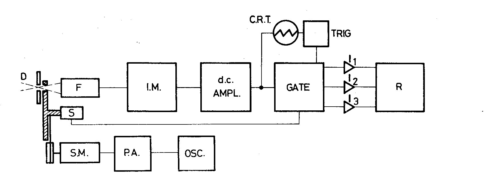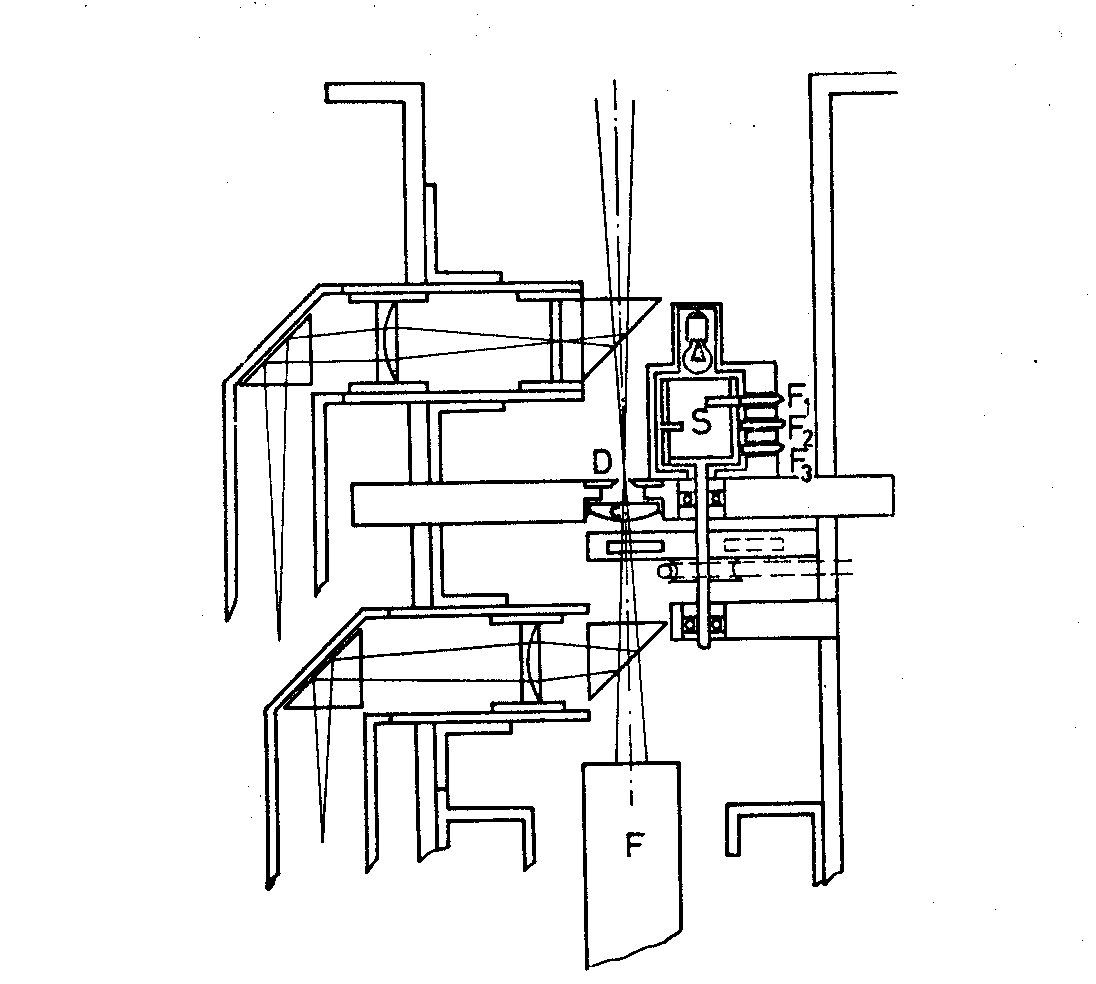 Fig. 2. Optics of the photometer. The device (S) consists of a small cylinder mounted on the same shaft as the filters' carrier-disc. This cylinder is internally lighted and its inside walls are reflective; besides, it is cut transversely with three slots 0.7 mm wide and of such a length that each subtends, with respect to the axis of the cylinder, the same angle at the center as the corresponding filter in the disc. The light paths that emerge from the three slots are intercepted, at a fixed position, by three photodiodes F_1, F_2, F_3, one for each window opening for the entire time that the corresponding filter passes under the diaphragm opening. The signals from the photodiodes pilot the gate. 3. THE ELECTRONICS OF THE PHOTOMETER The output of the photomultiplier is connected to an impedance matcher constructed with field effect transistors (Paterno 1967). At the matcher output, the voltage-pulses are amplified by a D.C. amplifier with variable gain from 1 to 1000. The amplifier consists of a cascade system of 5 identical operational amplifiers having strong negative feedback. The UBV pulses at the amplifier output are selected and led to the proper channel by means of three photodiodes operated gates. The gates consist of a mercury relais type Clare HGSM 51111LOO. All signals relative to each channel are detected and then, via integrator and differential amplifier, activate the recorder. 4. CHARACTERISTICS OF THE PHOTOMETER It must be noted, above all, that the chopping of the radiation does not change the signal-to-noise ratio, so taking into consideration that the system of the amplification practically eliminates all the noise of the electronic apparatus, it is possible to reach, integrating on convenient time intervals, the same limit magnitude which is reached utilizing all the incident radiation. The accuracy of the measurements, as known, is proportional to the total sum of the available radiation for each measure. Neglecting the radiation coming from the sky with respect to the signal, the average error (a.e.) of a measurement is given by the formula: a.e. = +-(1/nqt)^1/2 where n is the number of the photons due to irradiance of the star collected for a unit of time, q is the effective efficiency of the receiver and t is the exposure time. At present the photometer is placed at the f/10 quasi-Cassegrain arrangement of the universal 61 cm reflector. Considering a star of 10m, the number of photoelectrons obtained from the collected photons is about 10^4 sec^-1 (Allen 1963). Therefore, with an exposure of 1 sec the average error is about + - 0.01m for one measurement; averaging 10 measurements the error is reduced to + - 0.001m. In our photometer the exposure time of each measurement in one band is 0.5 sec. However, as it was noted, the gate circuit is very prompt in action, it seems possible not only to increase the exposure time up to 1 sec, but even to increase it, gaining in the efficiency of the photometer which at present utilizes only 25 per cent of the incident radiation. We have calculated that the magnitude limit which can be reached with our photometer, applied to a telescope of 61 cm, is 12.5m; this result was verified by the observations. At present, the photometer works with the 61 cm reflector and is used for a research programme on flare stars. Fig. 3 shows three photograms of oscilloscope tracings. They show the different responses of the photometer in the UBV for three stars of spectral types B6, G2 and K5 respectively (from the top to the bottom). Finally, Fig. 4 shows a flare of the star EV Lacertae, observed with our apparatus on 8 August 1968 at 23h23m, Universal Time.