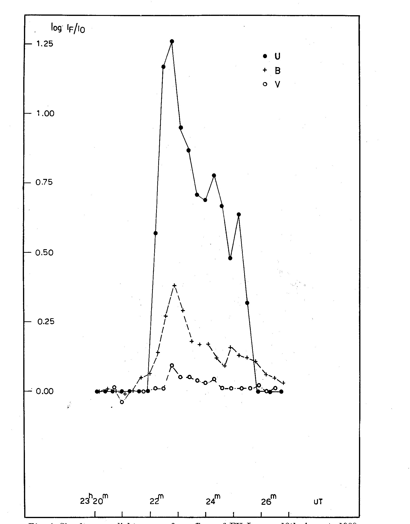 Fig. 4. Simultaneous light curves for a flare of EV Lac on 18th August 1968 in the UBV system REFERENCES Allen, C. M., 1963, Astrophysical Quantities, 2nd edit. Univ. of London, London. p. 191-192. Cristaldi, S. and Paterno, L., 1968, Synchronous three colour stellar photometer (in press) Mem. Soc. astr. Ital., 39. Paterno, L., 1967, Mem. Soc. astr, Ital., 38, 555. DISCUSSION Detre: I should like to hear something about your observing conditions, the location of your observatory, number of clear nights, etc. Cristaldi: The Catania Astrophysical Observatory has its stellar station on the Etna at about 1700 m of altitude. (We have a conventional reflector of 91 cm d ; 1 universal telescope Schmidt-Quasi-Cassegrain 61/41 cm f/3 and two others telescopes 30 cm d in Cassegrain arrangement.) In the summer all our instruments work for photoelectric photometry, but in the winter the Universal telescope in Schmidt combination is used for photography, its limit is about 17.5m. In the summer we have more than 60-70 clear nights for photoelectric work.