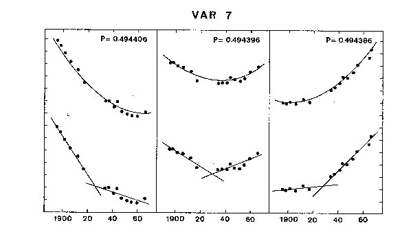 two-tenths of a cycle apart; those on the horizontal axes are twenty years apart.