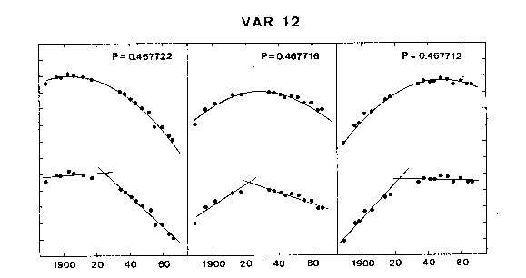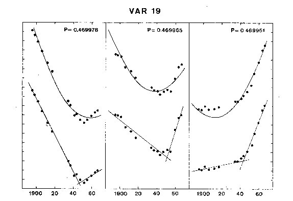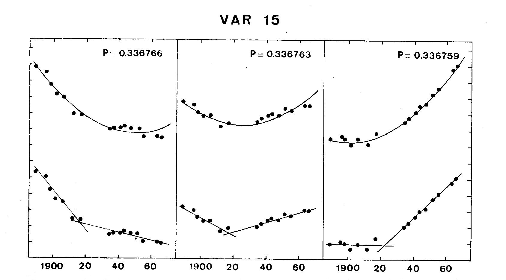 In the upper three diagrams, for each star, parabolas have been fitted to the