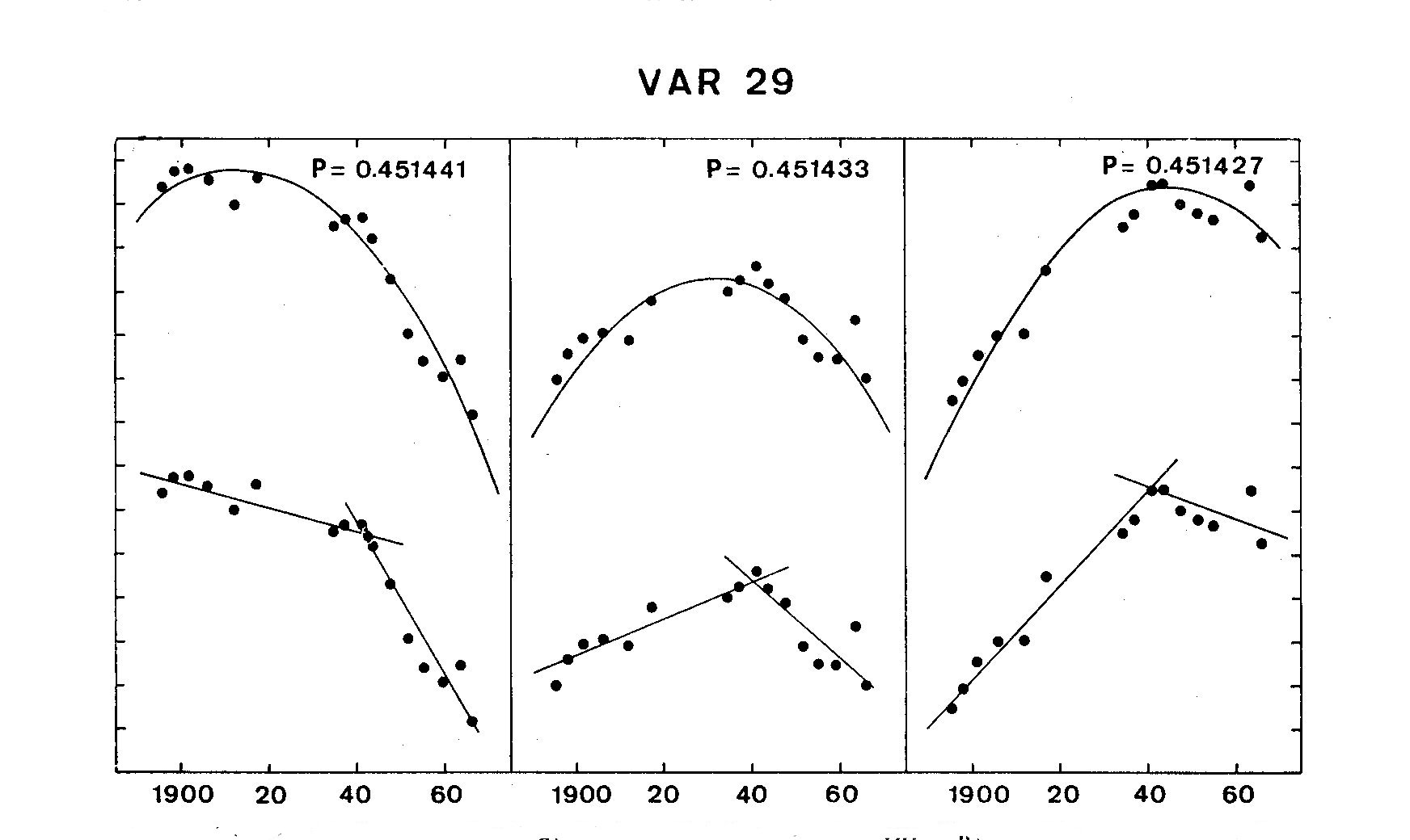 Figure 2e. O-C diagram for Var 29 in M5. The marks on the vertical axes are