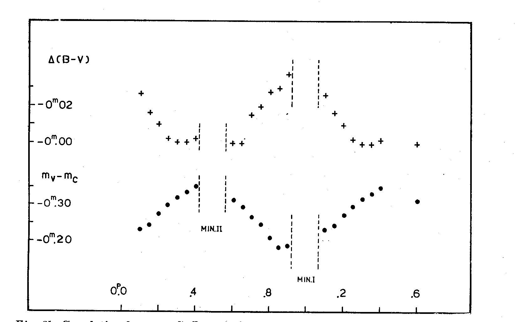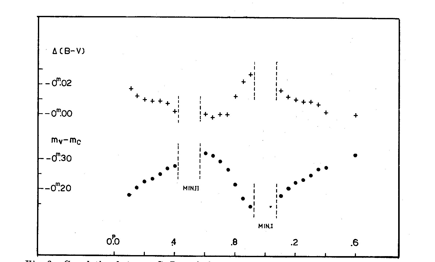 Fig. 3b. Correlation between C. I. variation (+) and the mean V light curve