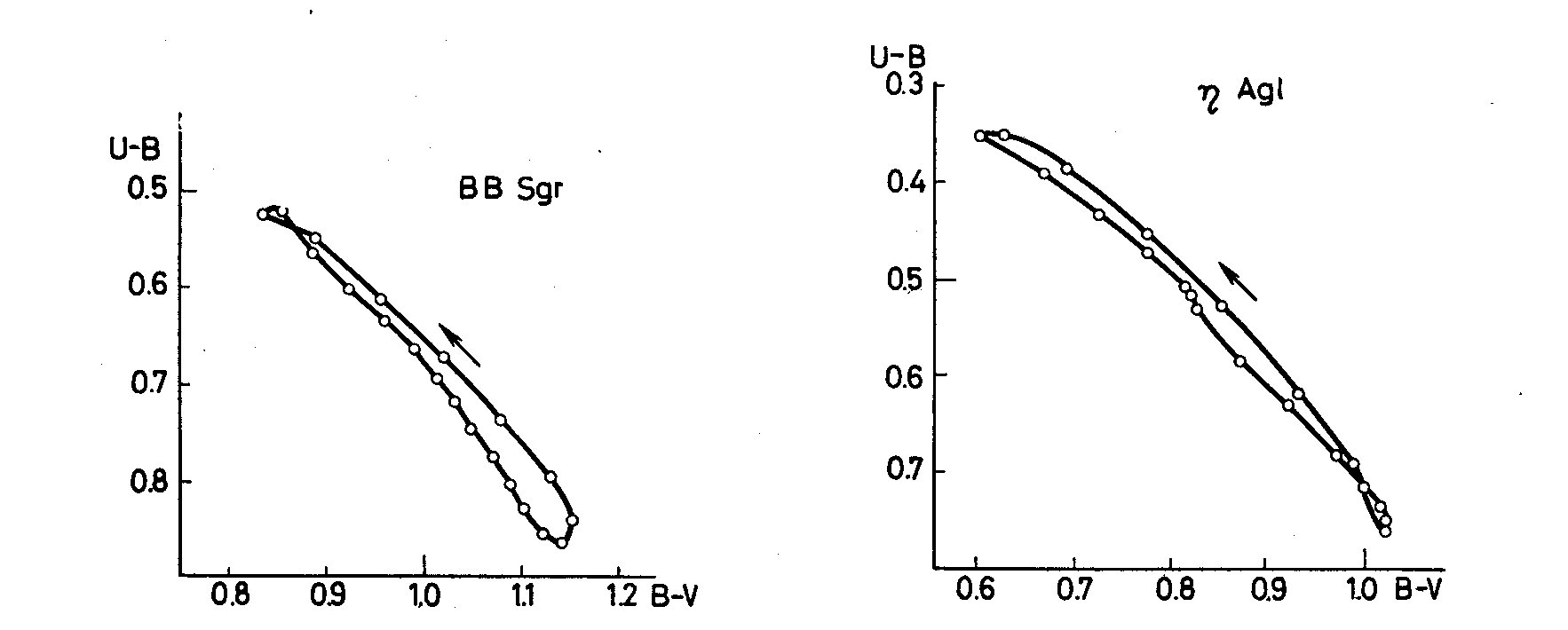 Since the areas limited by the cepheid curves on the (U-B)_0/(B-V)_0 plot do