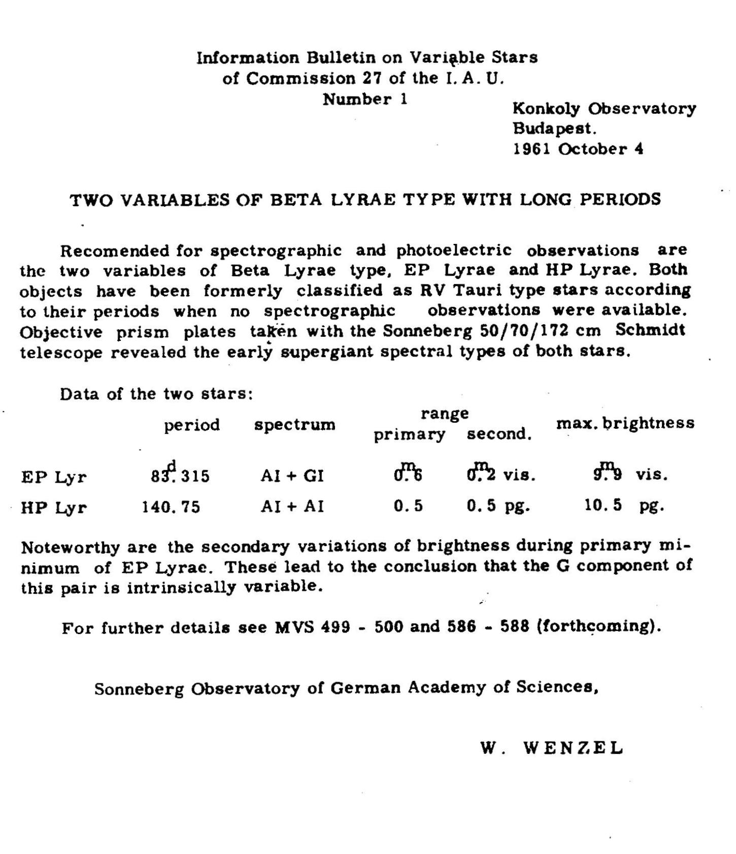 The first issue of the IBVS in 1961