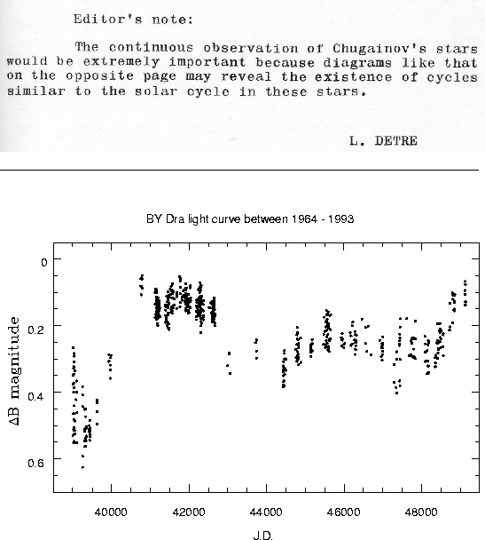 From the time of the discovery of starspots it was obvious to relate these features with those observed on the Sun for already centuries. Flares were thought to be huge eruptions on stellar surfaces, just like those detected on the Sun. The search for solar analogues on stars continued and Wilson (1968) initiated a long-term study for searching cycles of solar-type stars through measuring CaII H&K activity, which is continuing to date. But before this, already in 1966, L. Detre published a note of just once sentence, calling the attention on the possible presence of a spot cycle on BY Dra, as shown in Fig. fig3 (upper and middle panels). This small remark was surely among the first ones (if not exactly the first) suggesting cycles on other stars than the Sun.